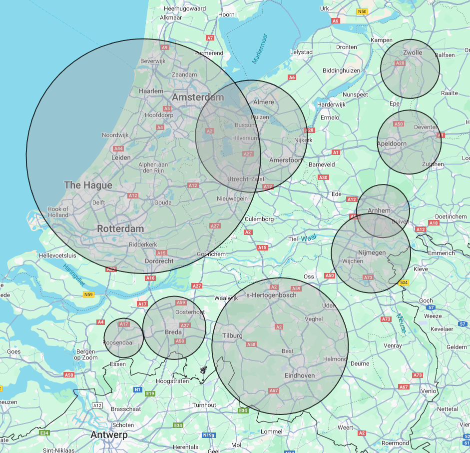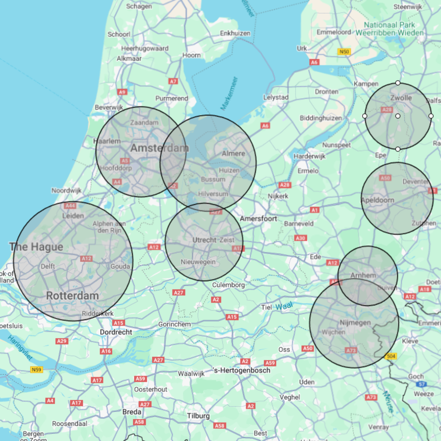 Wij bezorgen alle plekken die in de cirkels liggen.